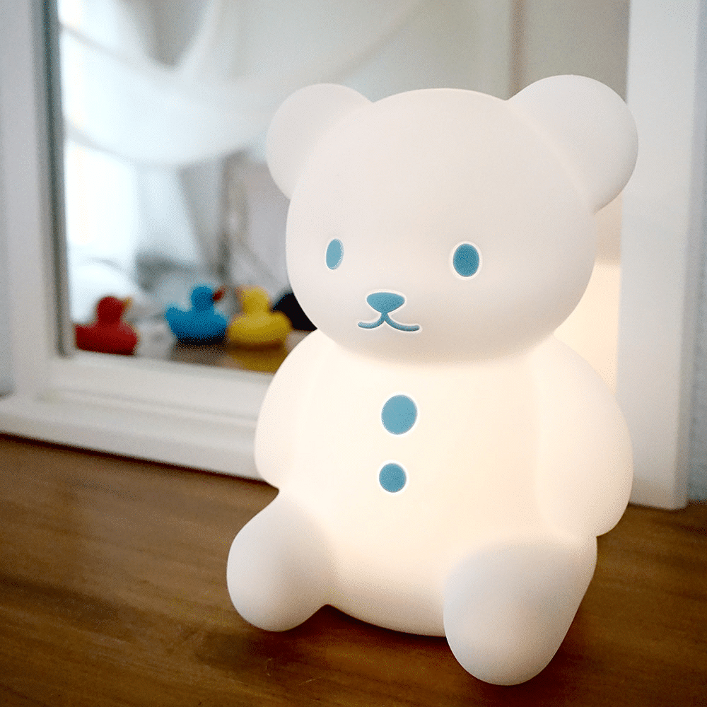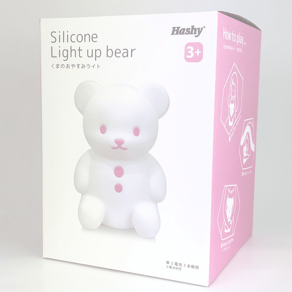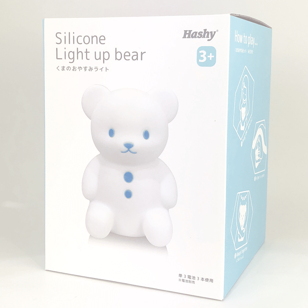 Hashy Top-In Bear Night Light – Blue Dimensions: Width 150× depth 130× height 200mm Combining a night light with a soft toy, it is made of safe silicone and is suitable for children. It has the function of automatic shutdown and brightness adjustment, so it is more safe to use at night. Brief description of the specifications:
